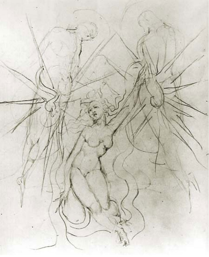 It is significant that the posture of the woman in this design is a combination of the attitudes of the two central figures in design 99 of the Dante series. That design, which must have been produced at about the same time, represents the Queen of Heaven Enthroned. The Virgin Mary is pictured naked holding a mirror and a fleur de lis on a staff like a sceptre or thyrsus. The Virgin with Blake again and again represents the evil Female Will, the source of the carnal part of Christ.