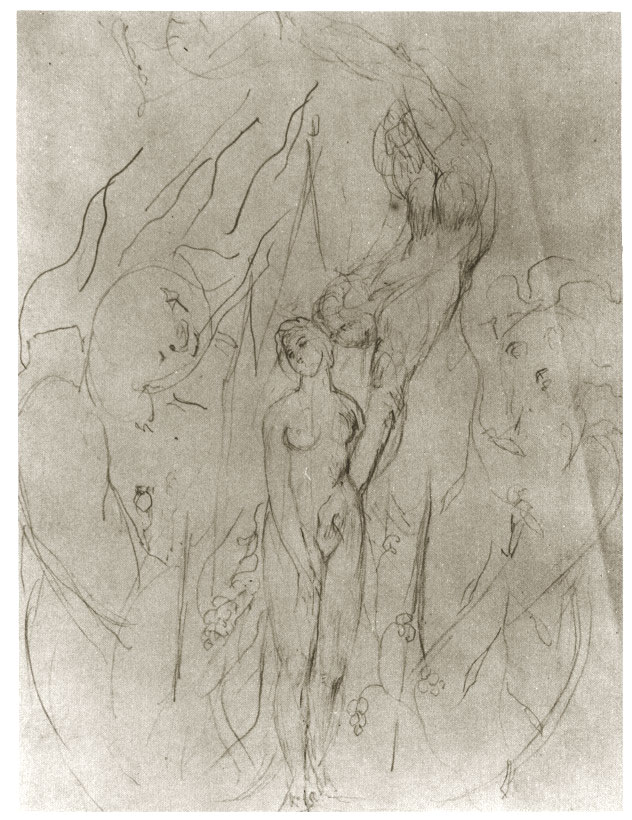 In the third drawing the moral debacle is complete. The woman has become a siren, or as we should perhaps say, vampire. Wearing the scales of sin, she rises exultant from the prone body of a man, while an innocent sister, balancing the composition, stands at his feet, frozen with grief and horror.