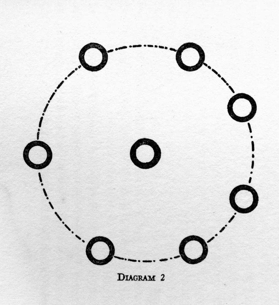 This diagram is based on one of the current conceptions of the structure of an atom. According to this conception an atom consists of a proton, a positive charge of electricity, around which revolve a number of electrons, negative charges of electricity, somewhat as planets revolve around the sun. The proton is the sun, the electrons are the planets. The electrons may be conceived in one orbit as in digaram 2. Or they may be conceived as grouped into two orbits, as in diagram 3. This represents in a rough way the structure of the epistle to the Romans. I have used a proton and two orbits of electrons rather than one orbit, because the epistle naturally divides itself into three parts, addressed severally to our three centres or foci of attention.